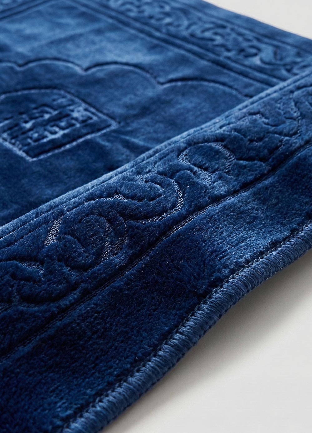 Add a touch of contemporary elegance to your spiritual practice with our Elite Royal Blue Velvet Prayer Rug. This piece stands out with its deep sapphire tone and a sophisticated, raised geometric pattern that frames a beautifully detailed central arch.
