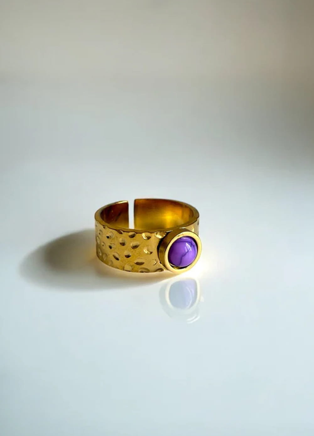 Elevate your style with this Purple Turquoise Ring, featuring real turquoise dyed in a striking purple hue. Crafted with 18k gold-filled stainless steel, it offers a tarnish-free, hypoallergenic, and waterproof design. This unique piece adds a bold, one-of-a-kind touch to any outfit