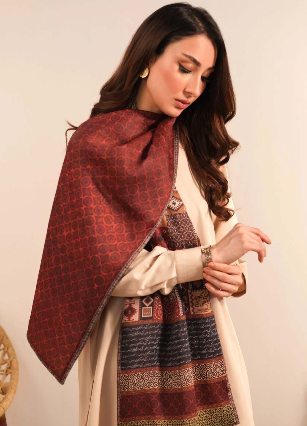 Double-sided crinkle silk stole, featuring Urdu calligraphy of poetry by Rahat Indori & beautiful Urdu words!