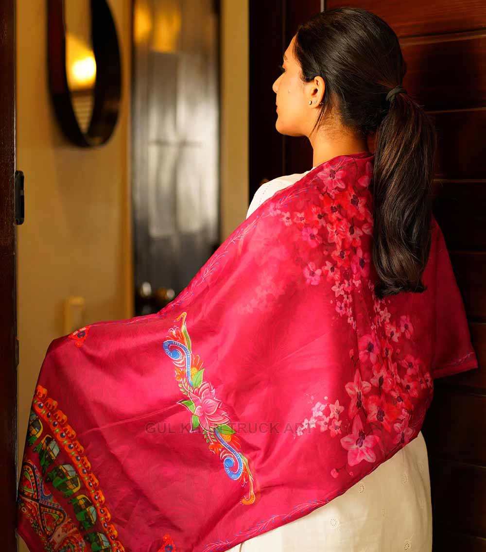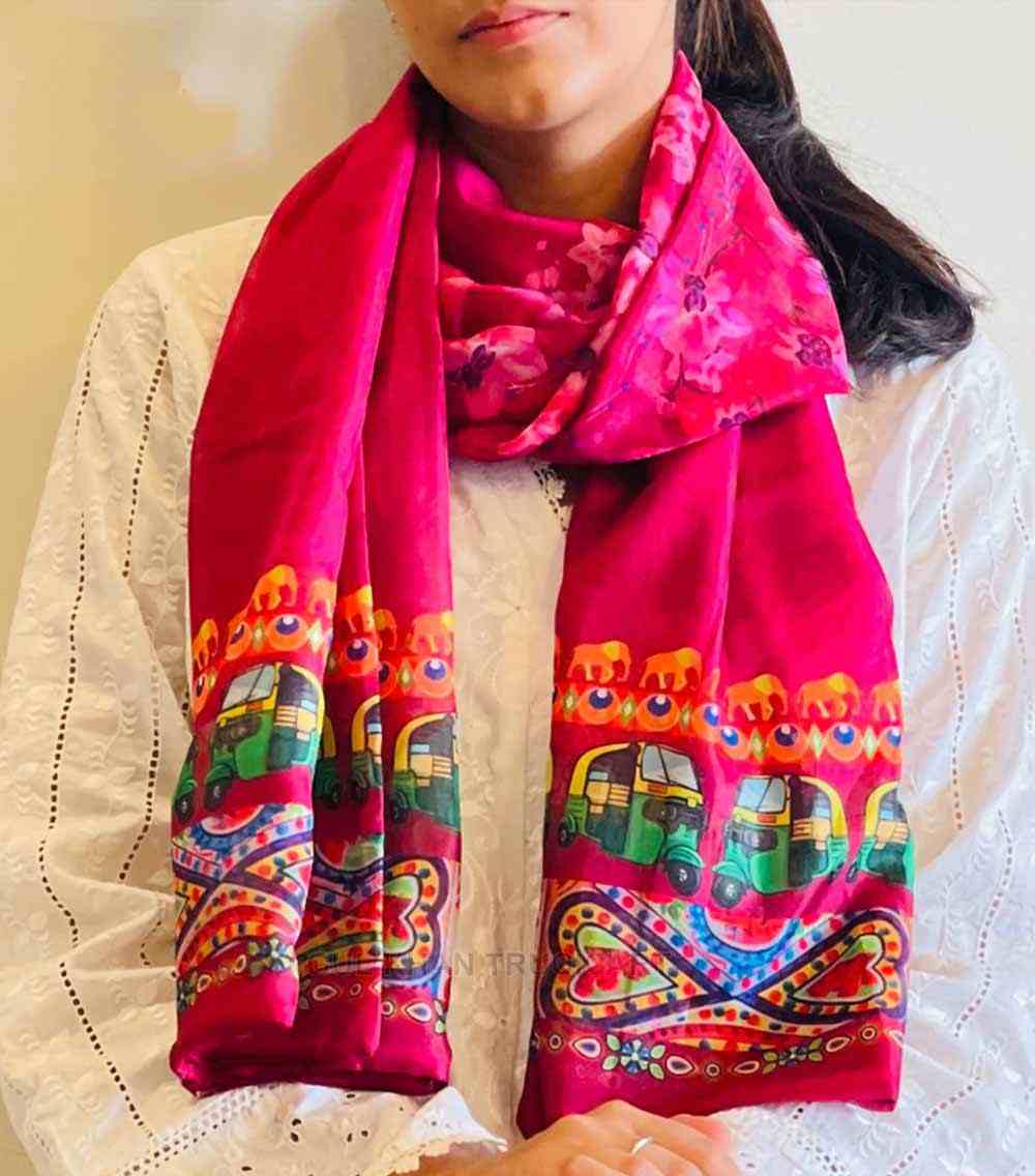Experience the wearable folk art of Pakistan with the Gul Khan rickshaw art pattern printed truck art stole. This vibrant accessory is digitally printed on high-quality silk fabric, giving it a luxurious, soft feel and an elegant drape.