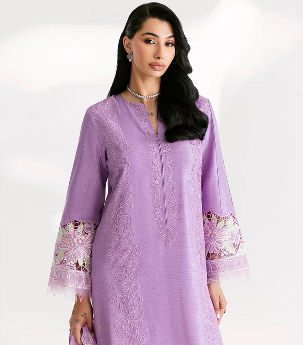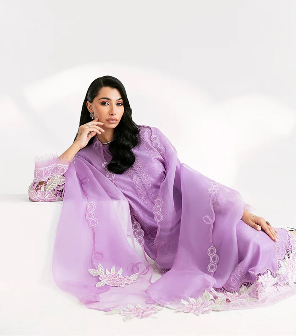 The pure organza dupatta adds a touch of sheer elegance, featuring delicate embroidery that enhances its charm. Intricate cutwork along the bottom creates a graceful finish, making it a perfect blend of sophistication and timeless detail.