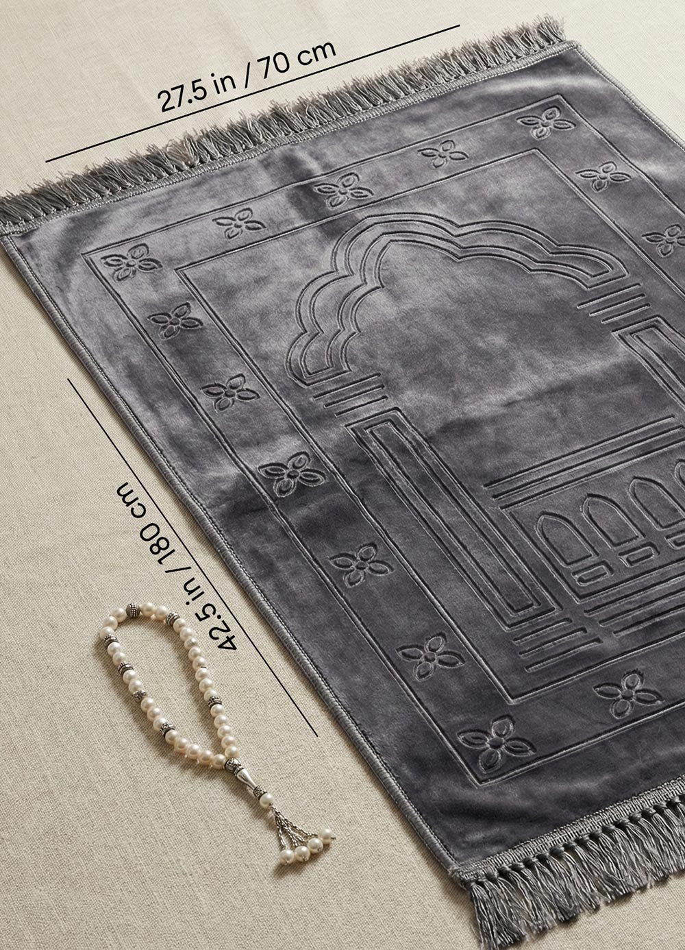 Cultivate a peaceful and focused prayer environment with our Serene Heritage Embossed Velvet Prayer Rug Collection.