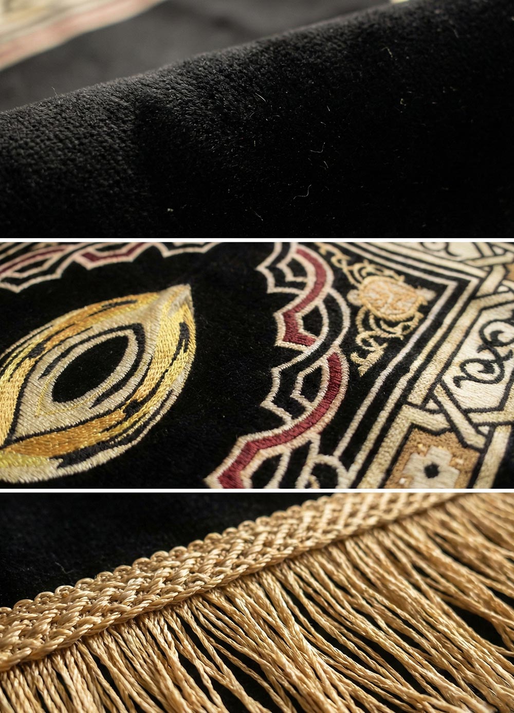 Each rug is masterfully crafted from high-pile, silk-touch velvet, providing a plush and luxurious surface that is gentle on the skin while offering vital cushioning for the knees and forehead during Sujud.
