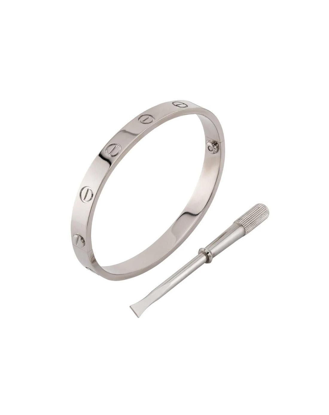Our Signature Screw Bangle is designed for modern elegance featuring a polished silver finish with iconic screw detailing for a bold yet refined look. Crafted from 18K white gold filled stainless steel, this bracelet is made to shine every day without fading, tarnishing, or losing its luster.