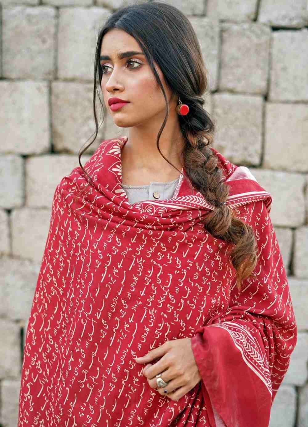 Our best seller cotton silk odhni, features Urdu calligraphy of poetry by Allama Iqbal.