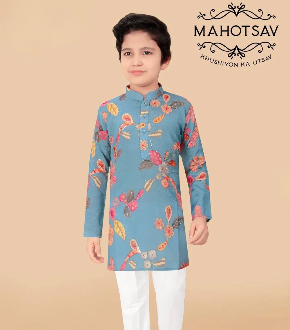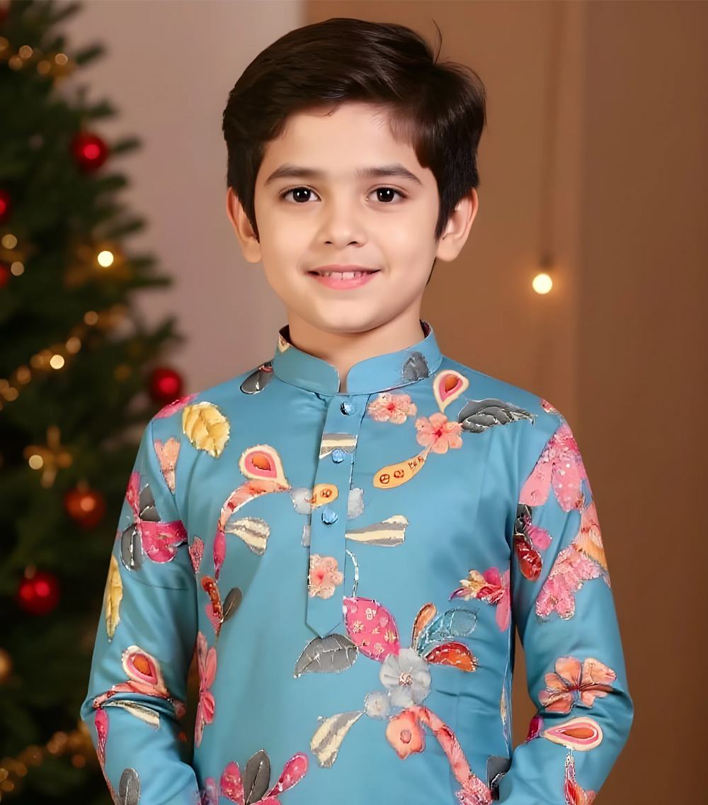Look stylish and festive with our Sky Royal Kurta Pajama. Made from soft cotton silk, it features a unique position print design. A must-have for boys who want to stand out during special occasions.