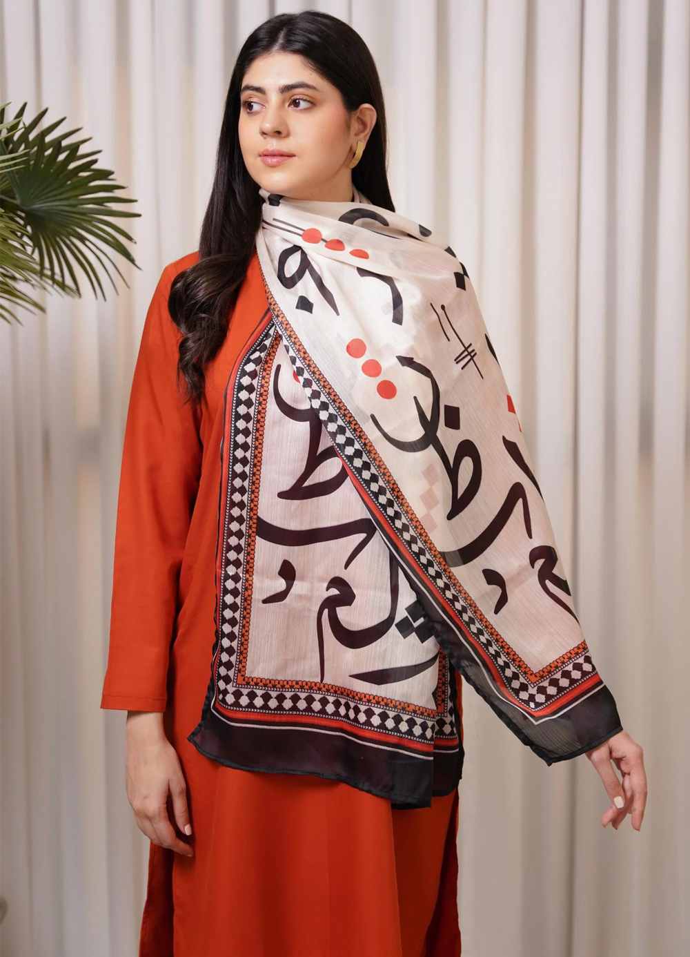 Features random Urdu letters throughout the scarf.