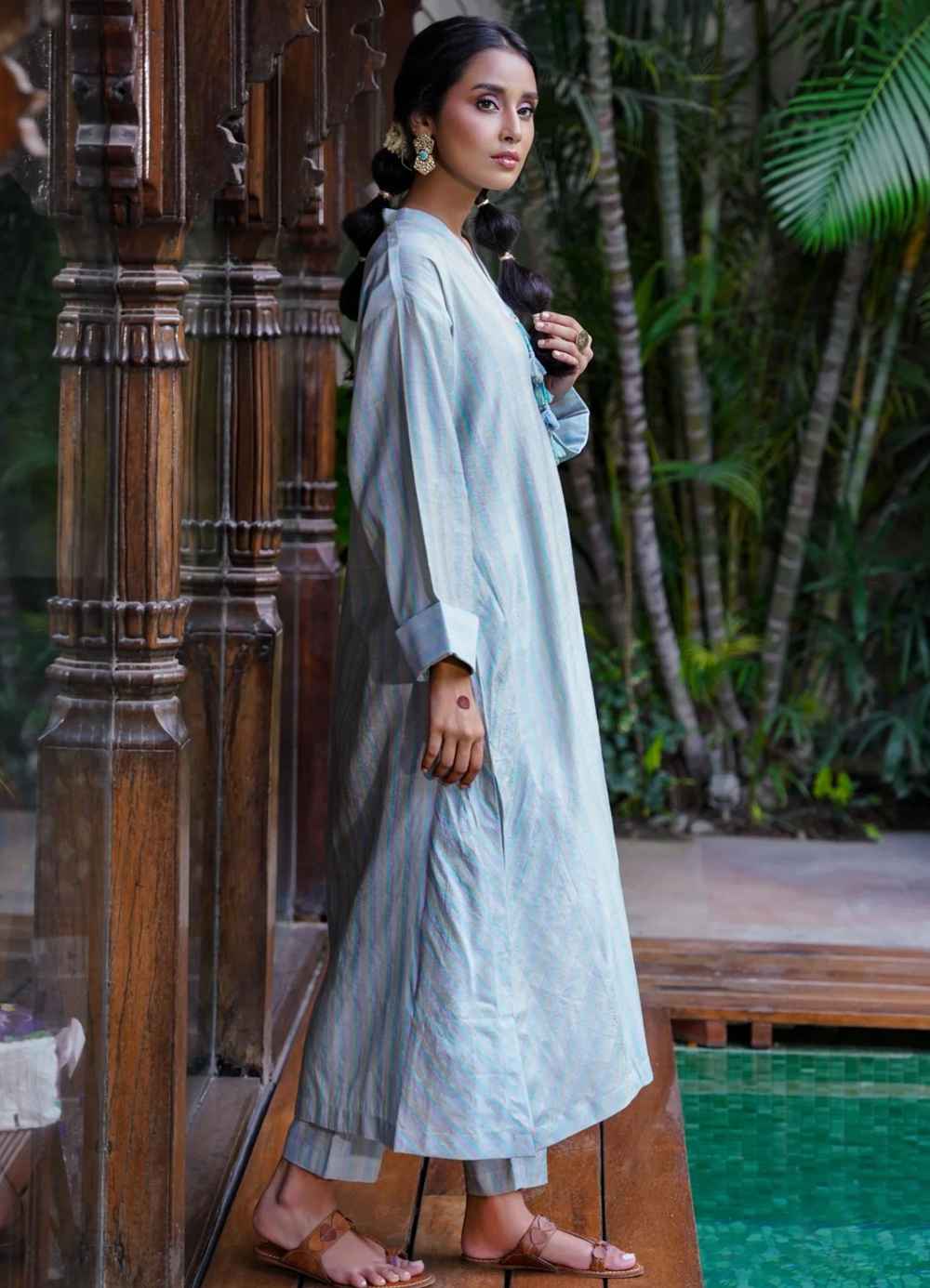 Yarn dyed 2-piece set features a long A-line silhouette with drop shoulders and a stylish three-panel design,
