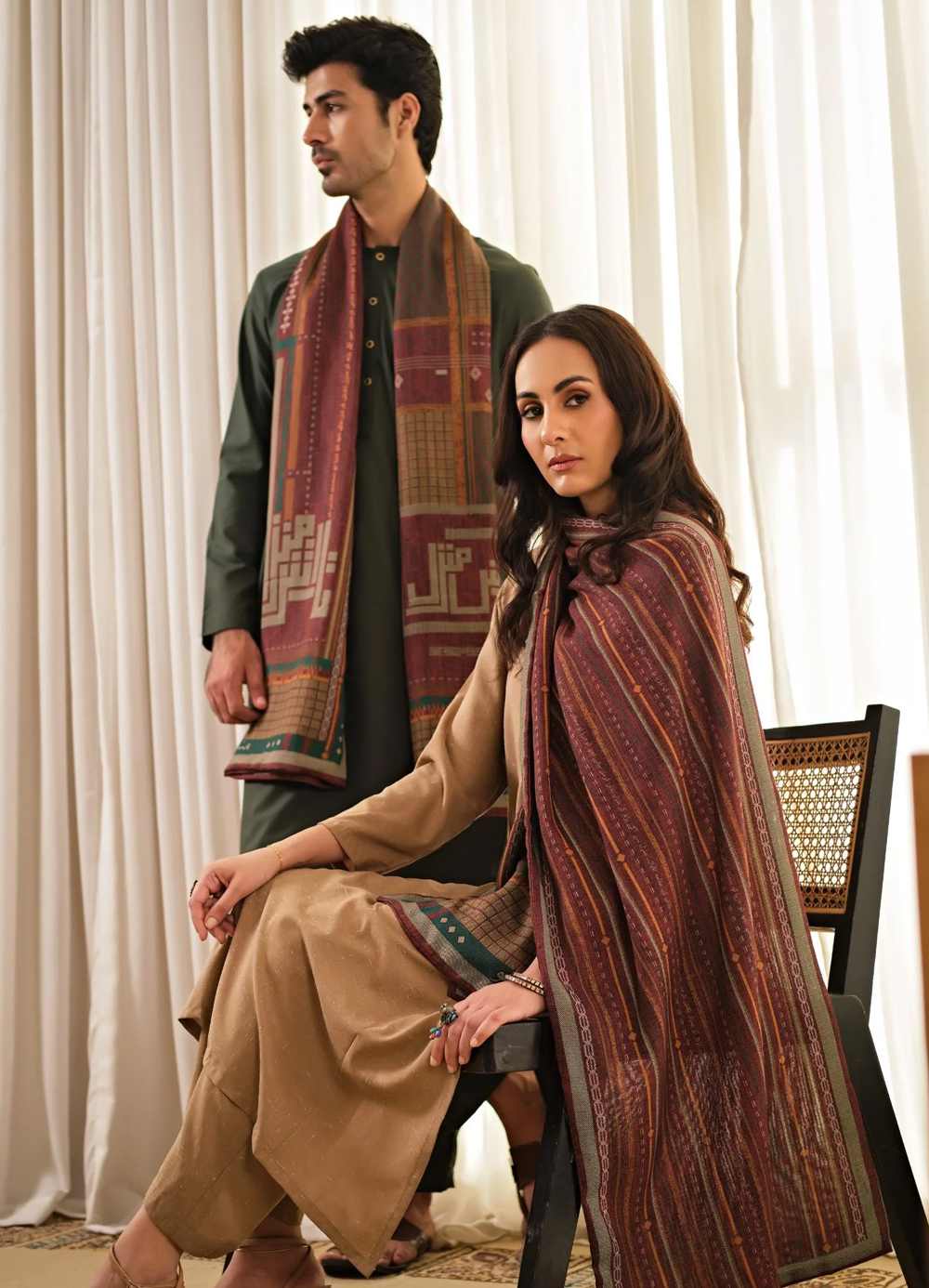 Double-sided Textured Herringbone Stole, featuring Urdu calligraphy poetry by Allama Iqbal. Available in 2 colours.
