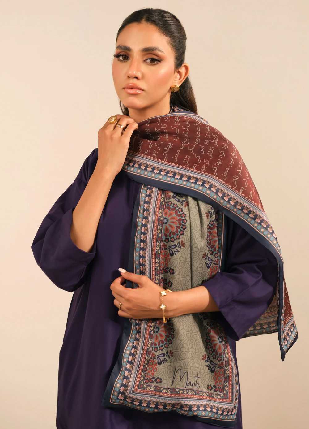 Double-sided crinkle silk stole, featuring Urdu calligraphy of poetry by Nida Fazli.