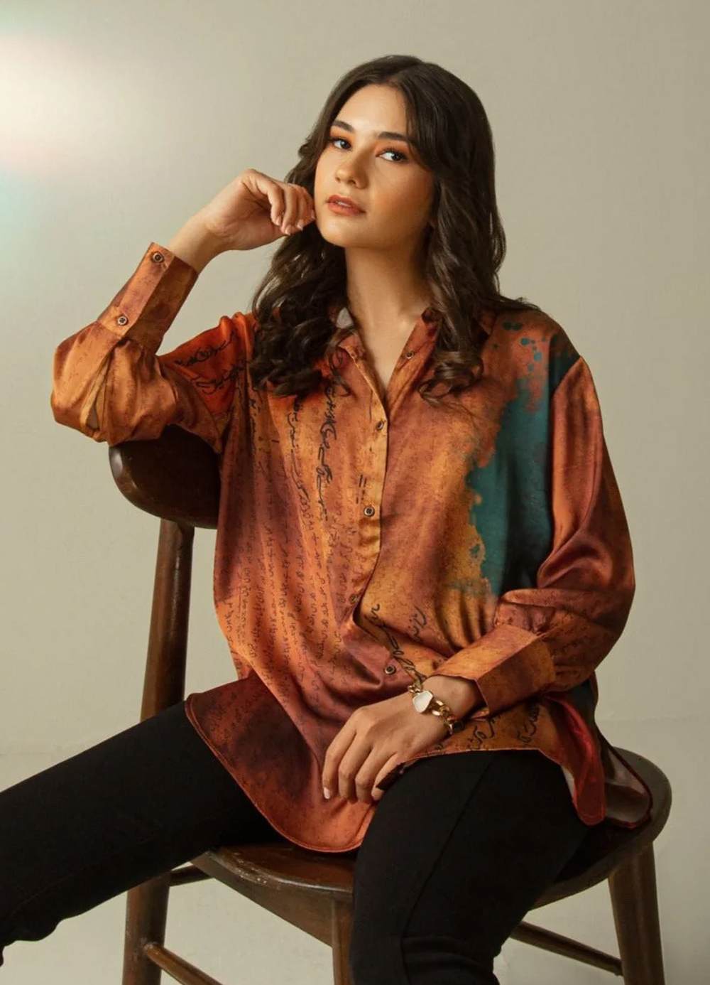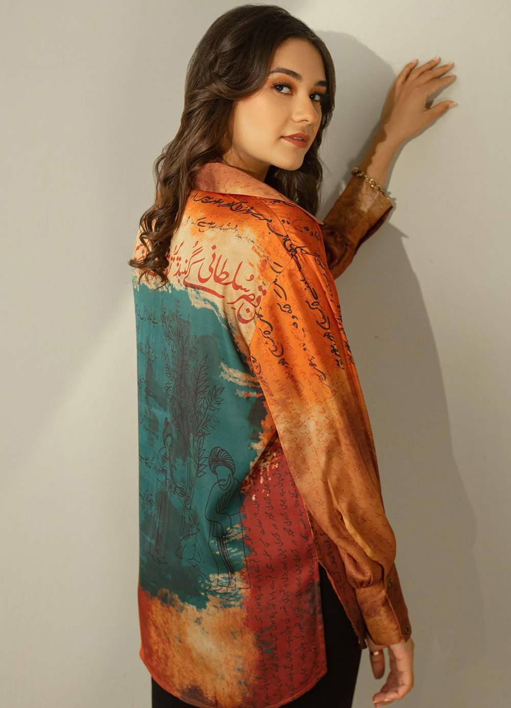 Charmeuse Silk Printed Button Down Shirt Featuring Urdu Calligraphy Throughout!