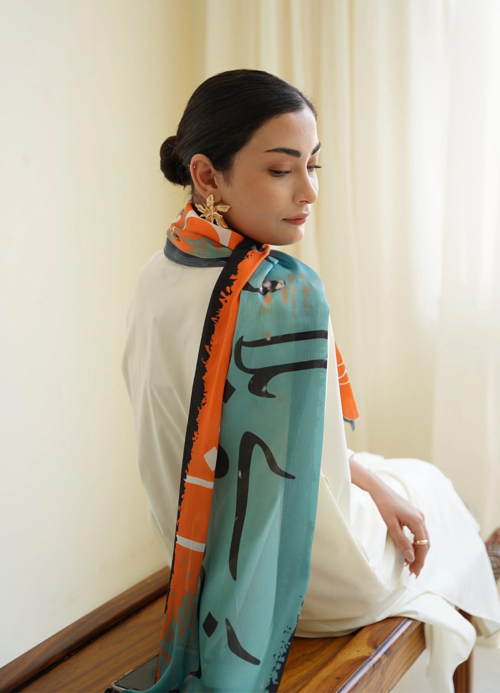 Double-Side Printed Crinkle Silk Stole Featuring Urdu Calligraphy of Poetry by Jaun Elia.