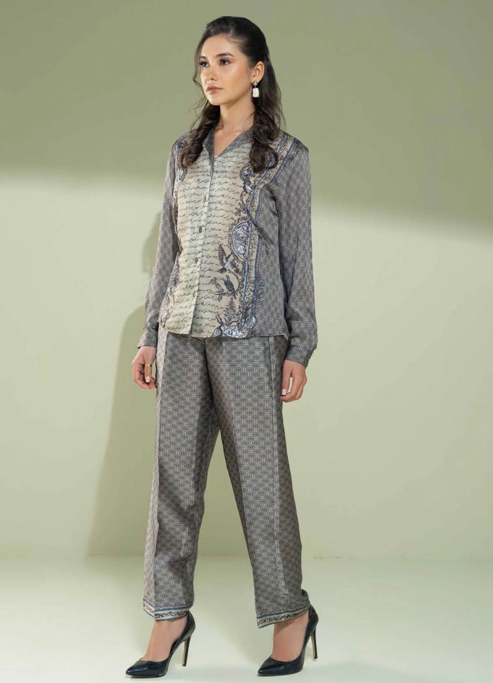 Charmeuse silk 2-piece set, with button-down shirt & straight pants. Featuring Urdu calligraphy of poetry by Allama Iqbal & Illustration of National Elements of Pakistan.