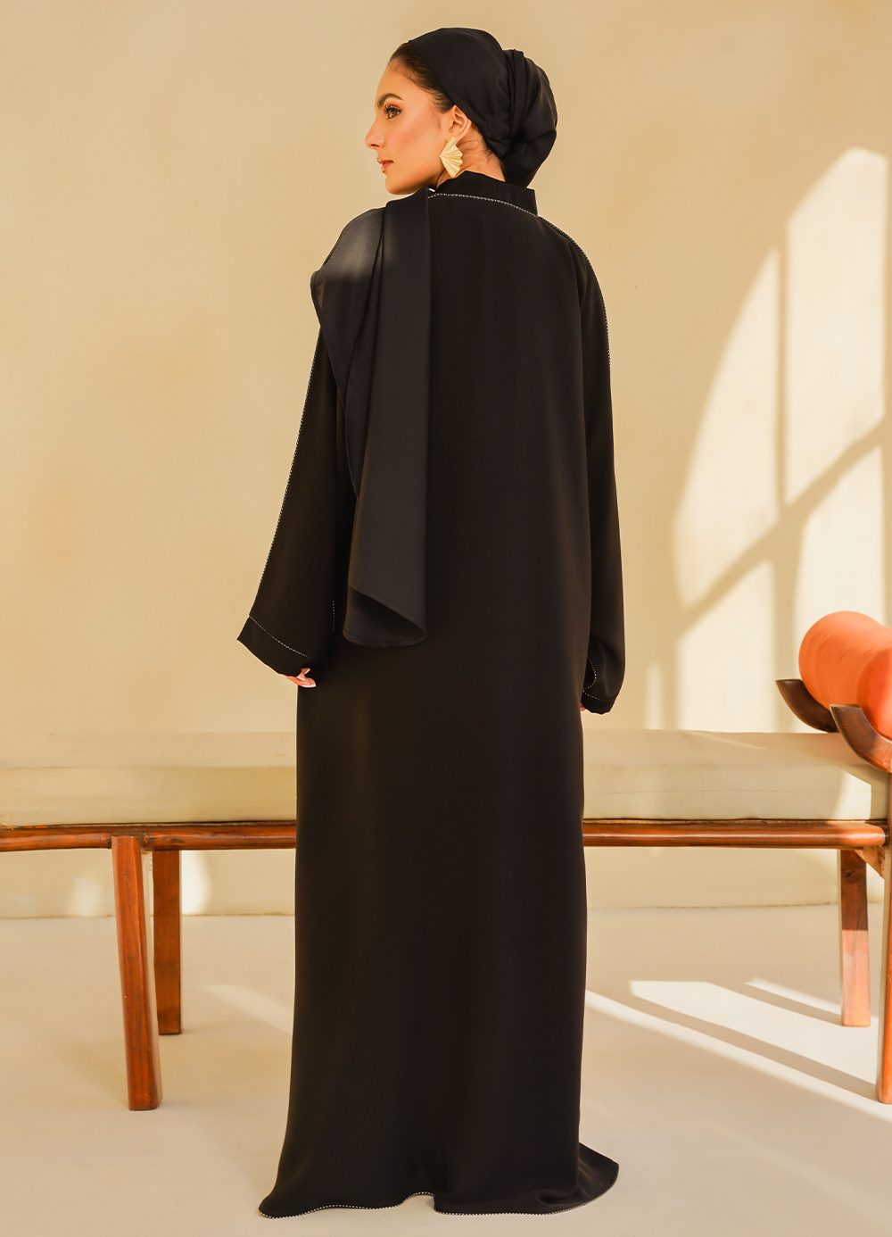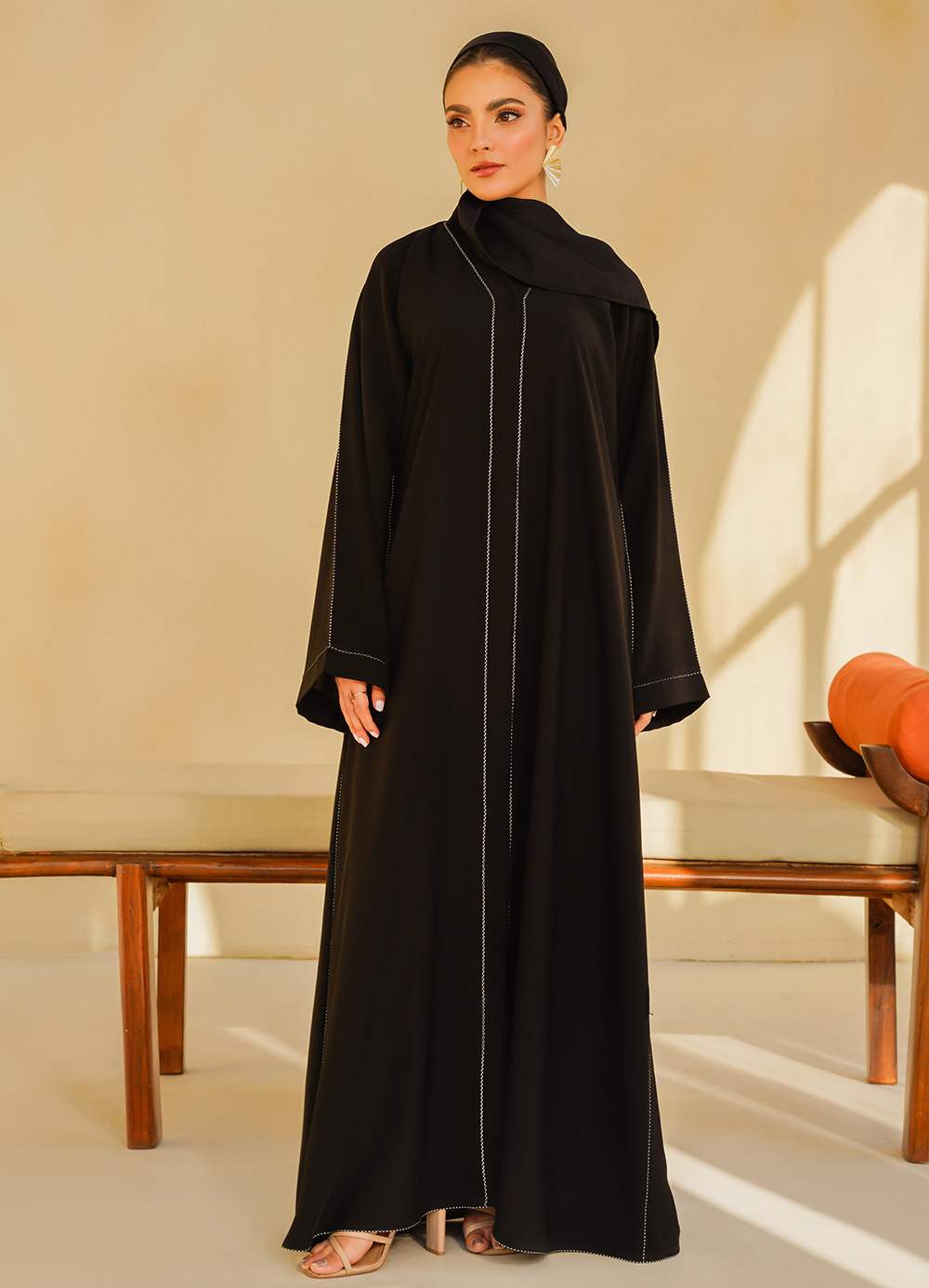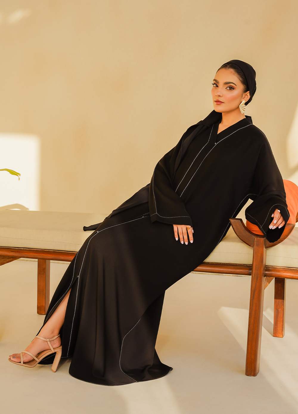 This abaya features a straight-cut silhouette with contrast stitching along the front and sleeves, creating a refined and minimalist look.