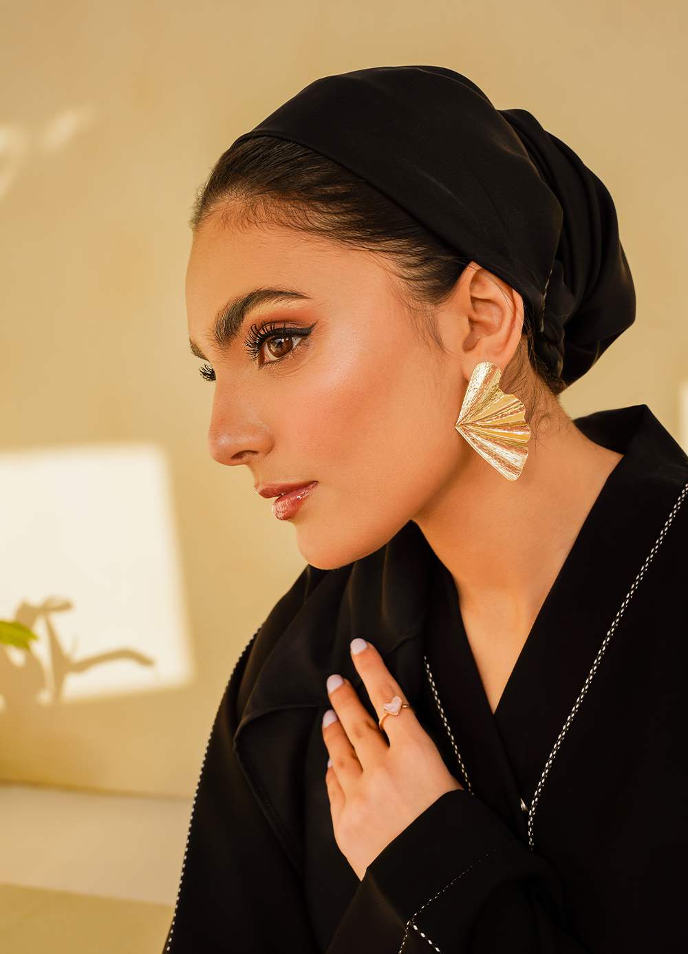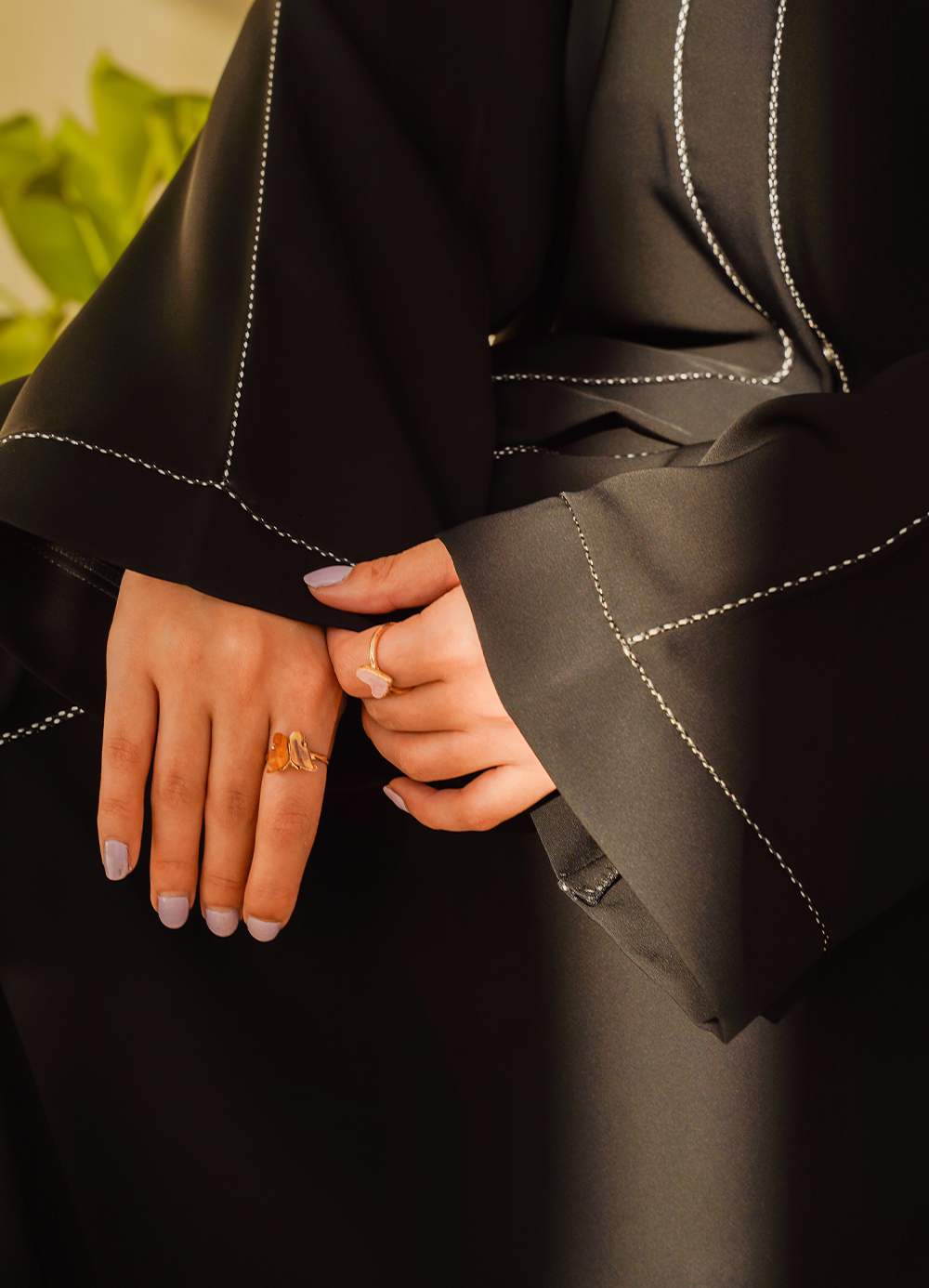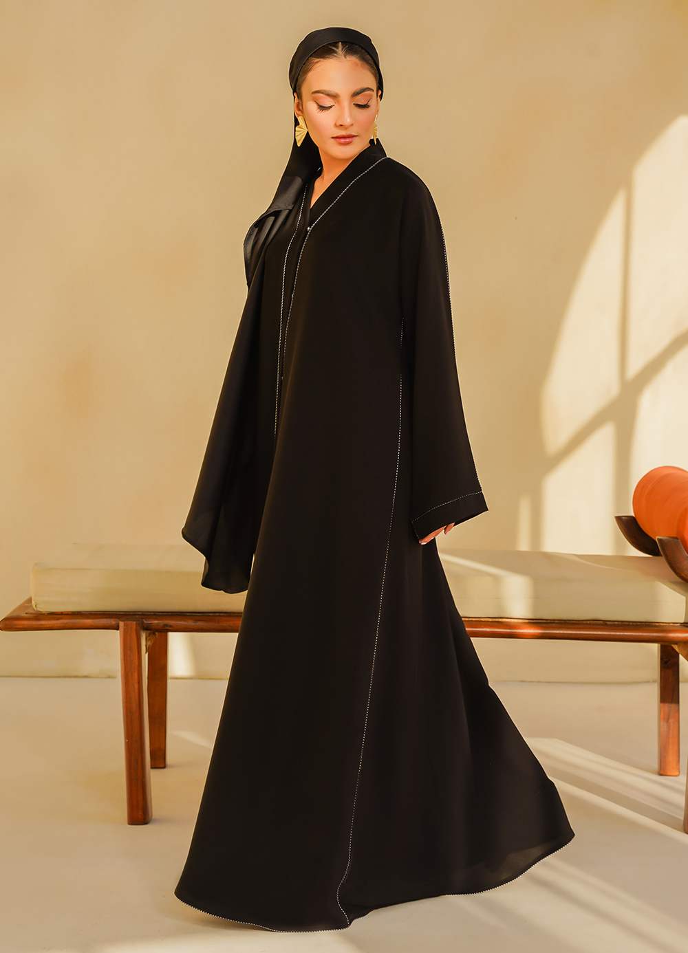This abaya features a straight-cut silhouette with contrast stitching along the front and sleeves, creating a refined and minimalist look.