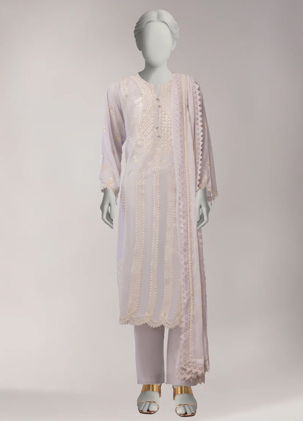Intricate embroidery, handwork, and lace elevate this long kurta set into a statement of subtle glamour. The Magsi slit neckline and full sleeves, paired with dyed trousers and a heavily embroidered dupatta, ensure a refined, luxurious look. Fit: Regular Fit Fabric: Embroidered Dyed Lawn Neckline: Magsi Neck with Slit Front: Embroidered Front Back: Embroidered Back Sleeves: Full Sleeve with Embroidery Style Cut: Regular Kurta Length: Long Embellishment: Embroidery, Handwork, Laces Style: Trousers Fabric: Dyed Lawn – Dupatta Fabric: Embroidered Dyed Impure Chiffon