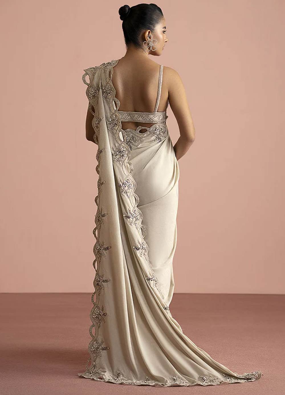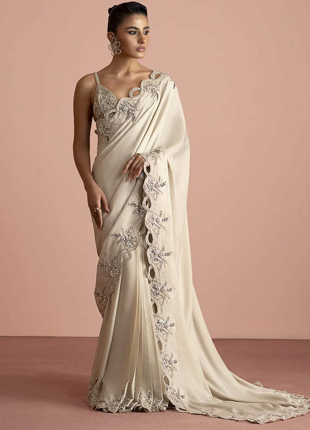 This ethereal saree combines minimalism with elegance. The blouse is intricately worked with Swarovski, cut daana, and crystals. The saree features a beautifully scalloped border with delicate floral embellishments for a luminous, graceful finish.