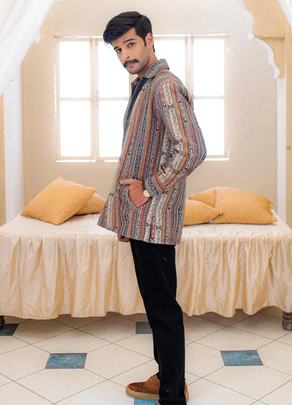 Unisex Loose fit Khaddar Overshirt, made from 100% cotton. Features Urdu calligraphy of words by Jigar Murad Abadi.